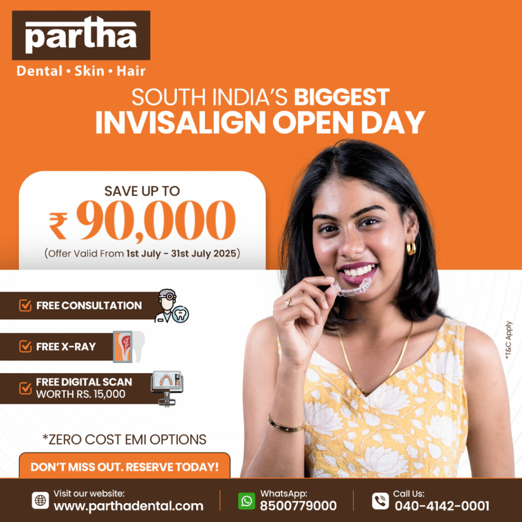 Just call or chat with Partha Dental to book your appointment instantly, or walk into your nearest branch in Hyderabad, Chennai, or Bangalore. Slots are limited, so book early and don’t miss out!
